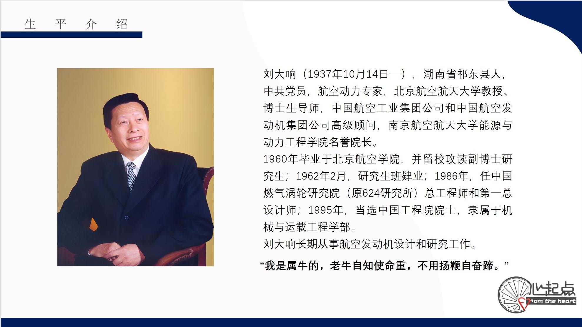 刘大响院士是中国航空动力界的第一批院士,亚洲第一台高空模拟试车台的主要技术负责人。多年来,刘大响院士扎根基层开展科研,他曾经隐于青山深处三十载,为我国航空动力事业作出突出贡献。刘大响院士常说:“我是属牛的,老牛自知使命重,不用扬鞭自奋蹄。